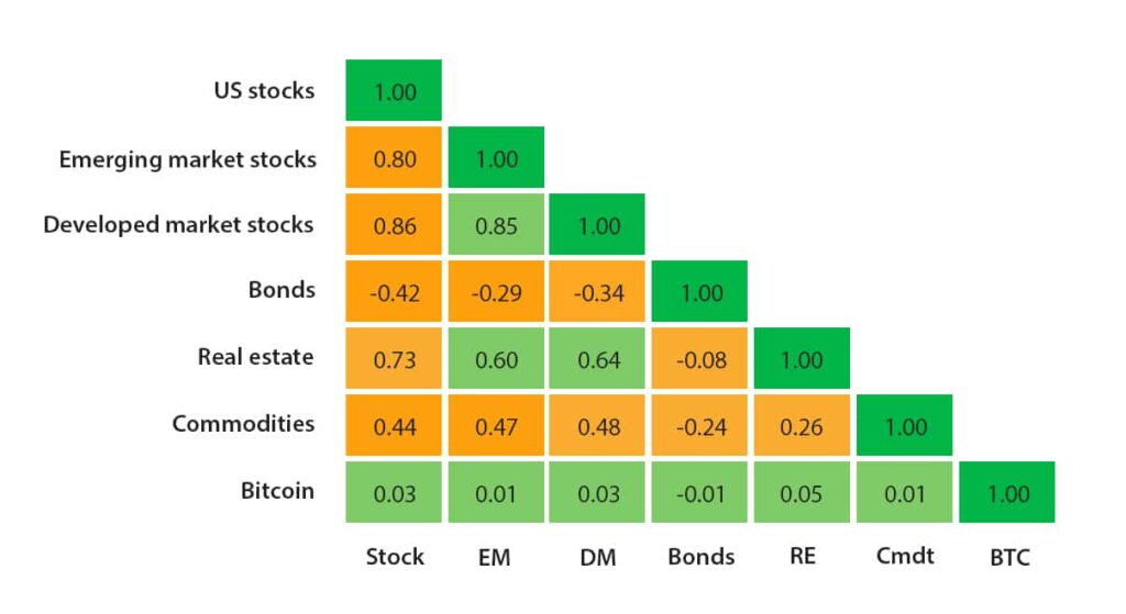 In essence, between traditional asset classes like Stocks, Bonds, Real Estate, and Commodities, certain patterns can be seen in their performances over the years – these patterns make such assets correlated to each other. What makes Bitcoin unique is its non-correlation with any other asset class. This absence of correlation makes Bitcoin a perfect asset for portfolio diversification.