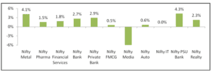 Among sectoral indices, 10 out of the 11 sectoral indices ended in green for the week, led by Nifty PSU Bank Index’s 4.3% gain. Other prominent gainers for the week were Nifty Metal (+4.1%), Nifty Private Bank (+2.9%), Nifty Bank (+2.7%), Nifty Realty (+2.3%), Nifty Financial Services (+1.8%), and Nifty Pharma (+1.5%), while Nifty Auto (+0.6%), Nifty FMCG (+0.5%) and Nifty IT (+0.01%) closed the week on a flat note. Nifty Media Index was the sole loser for the week with 7.3% loss, mainly contributed by Zee Entertainment’s around 18% decline.